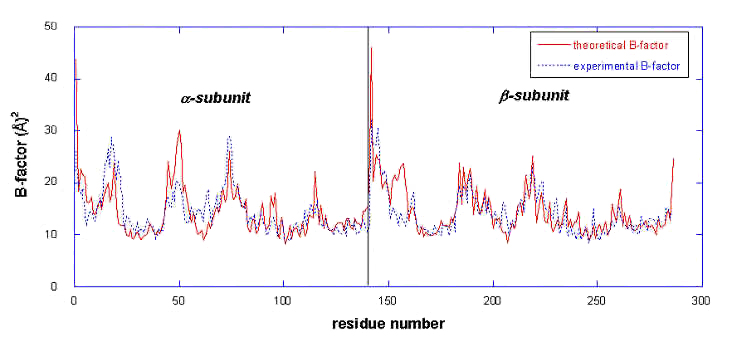 Comparison of theoretical (solid curve) and experimental (dashed curve) temperature factors for the a-carbons in the chains a1 and b1 for HbA a2b2 tetramer.