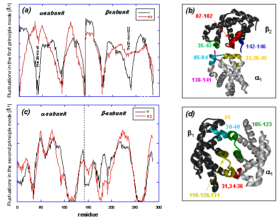 (a).Distribution of ms fluctuations driven by the global mode of motion. Maxima refer to flexible regions, and the minima to hinge sites. Note that compared with T, two minima at a36-45 and b87-102 disappear in the R form, suggesting a loosening or relaxation, and thereby an impediment in the mechanical function of the hinge sites. The dynamics of a- and b-subunits are very similar in the T form, while the dynamics are different in the R2 form.