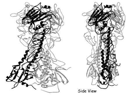 Bending of the globular heads while the stemlike region is almost rigidly affixed.