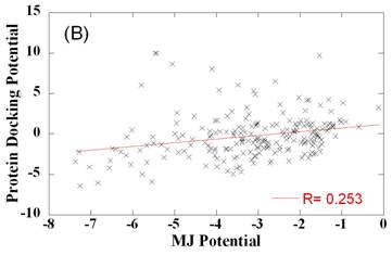 Comparison of side chain-side chain contact potentials for protein docking and protein folding. Panel A and B compare the optimally designed PDPs (ordinate) with the TE (panel A) and MJ (panel B) potentials derived from folded structures. Weak correlation is observed between the two sets. Panel C compares the two sets of folding potentials. The best fitting lines and correlation coefficients are shown on the panels.