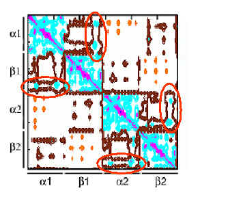The two axes refer to residue indices. The regions colored magenta, blue, brown and orange refer to strongly correlated, correlated (Cij > 0), uncorrelated (Cij » 0) and anticorrelated (Cij < 0) pairs, respectively. The subunits are indicated by the bars parallel to the axes. Blue blocks indicate positively correlated units (intrasubunit correlations for a1, b1, a2 and b2 domains) and the off-diagonal encircled (by red ellipses) blue regions indicate the interdomain correlations between subunits a1 (or a2) and b1 (or b2). Anticorrelated (concerted but opposite direction) motions are observed for the subunit pair a1- a2, as well as the pair b1- b2. Results are presented for 1a3n. 1bbb and 1hho showed similar behavior. |