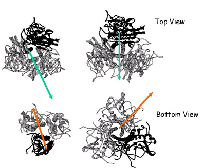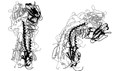 Bending of the globular heads while the stemlike region is almost rigidly affixed.