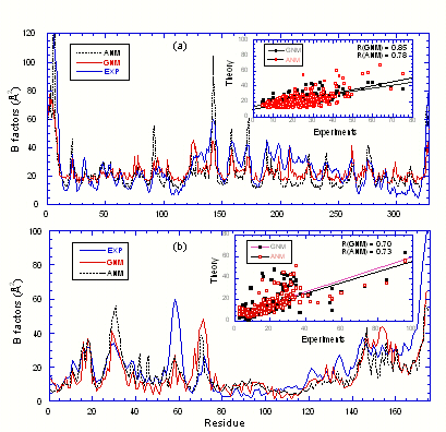 of theoretically (curves labeled GNM and ANM) calculated B-factors