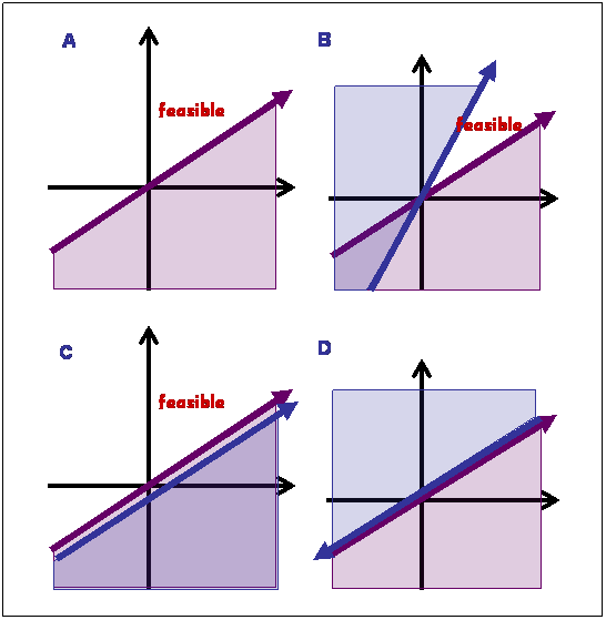 The choice of a linear form for the energy function enable us to efficiently optimize the parameters, such that, the energy of the native state will be lower than that of every non native state. Each inequality divides the parameter space into two regions (A): allowed (each point in the space represent a valid solution) and forbidden A given inequality may give rise to three outcomes: It may (B) reduce the space allowed for the parameter set (most desirable), have no effect on the allowed space (C), or  impose an impossible condition (no solution exist) (D). Optimization was done using the interior point algorithm BPMPD