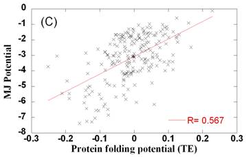 Comparison of side chain-side chain contact potentials for protein docking and protein folding. Panel A and B compare the optimally designed PDPs (ordinate) with the TE (panel A) and MJ (panel B) potentials derived from folded structures. Weak correlation is observed between the two sets. Panel C compares the two sets of folding potentials. The best fitting lines and correlation coefficients are shown on the panels.