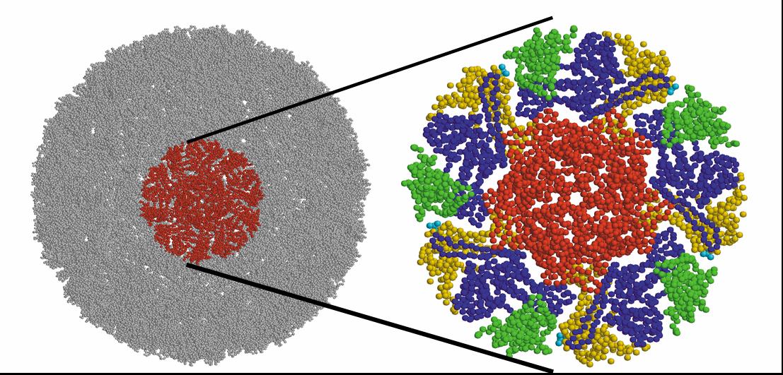 Step 2.  Build a substructure (see above) centered around a pentamer (red) and repeat the calculations now with full residue detail for the substructure and a bath representing the effective interactions with other residues (gray). The substructure (right) is color coded according to the chains.