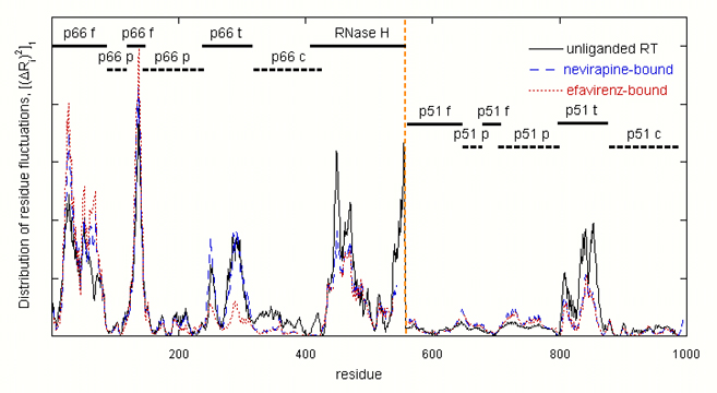 The p66 fingers tend to be decoupled from the p66 thumb in the presence of nevirapine. See the sharp extrema at the p66 fingers in Y-direction, and the inversion in the direction of fluctuations in Z-direction.