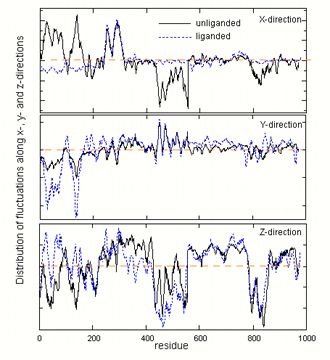 suppressed in the ligand-bound form (X-direction); in the unliganded form